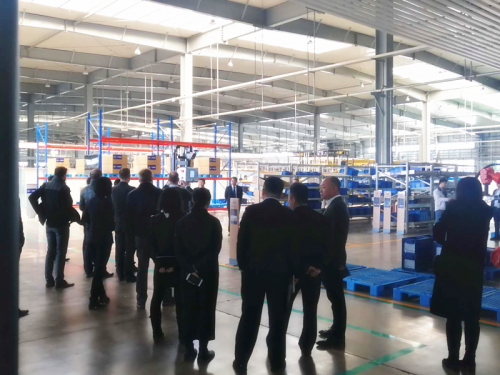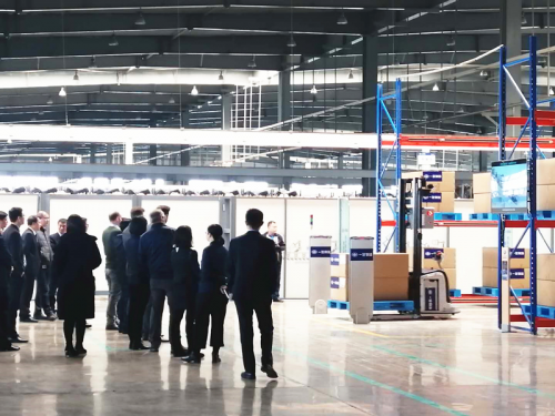 圖為一汽及大眾汽車的領(lǐng)導(dǎo)參觀Geek+無(wú)人叉車作業(yè)